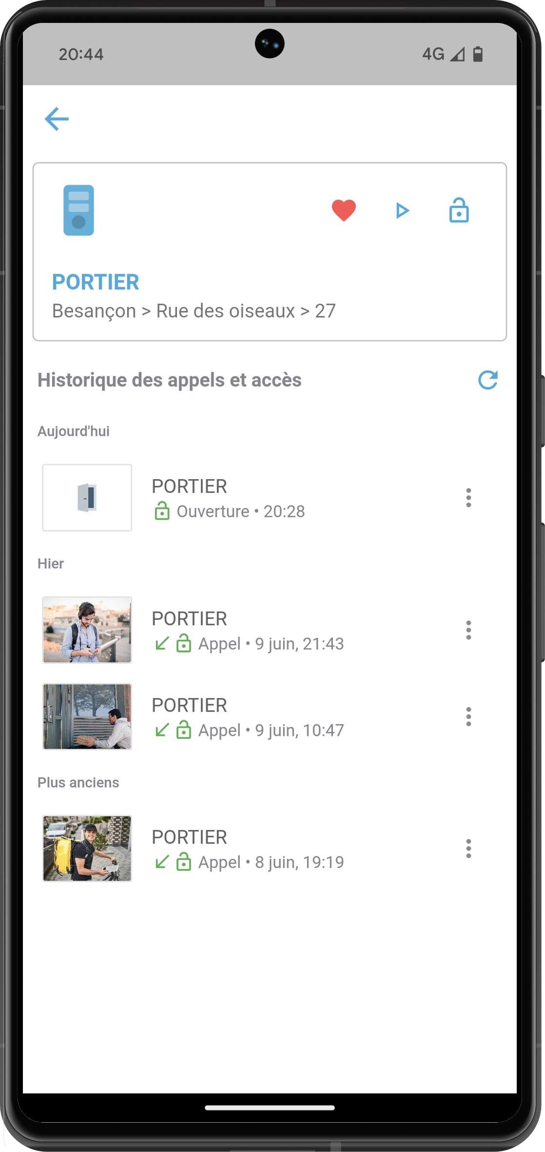 Recevez des appels vidéo de votre interphone sur votre mobile. Communiquez avec vos visiteurs en temps réel et contrôlez l'ouverture des accès à distance en toute simplicité.